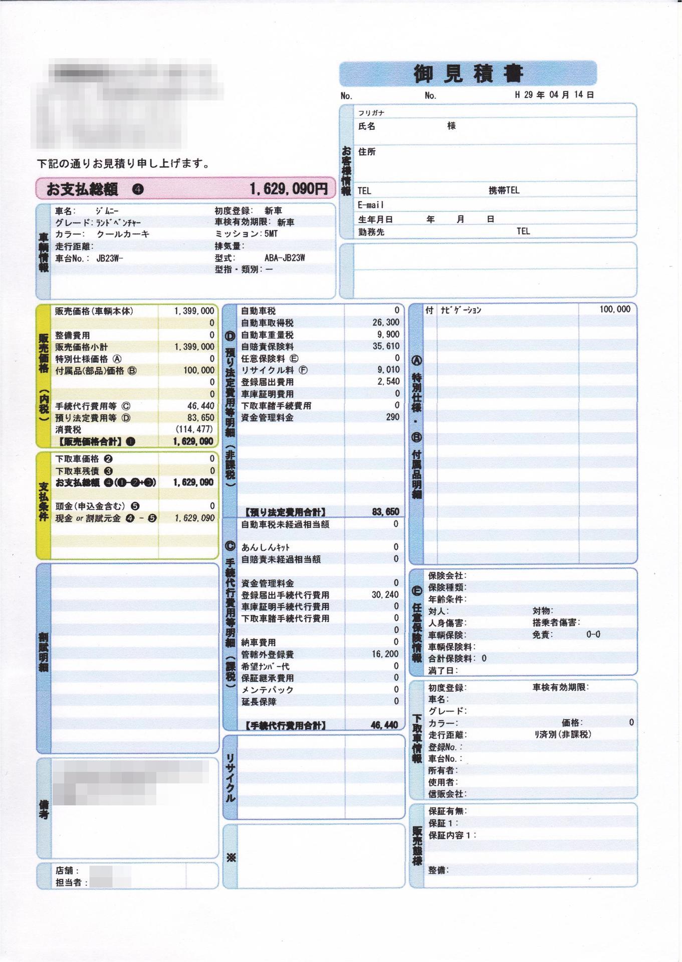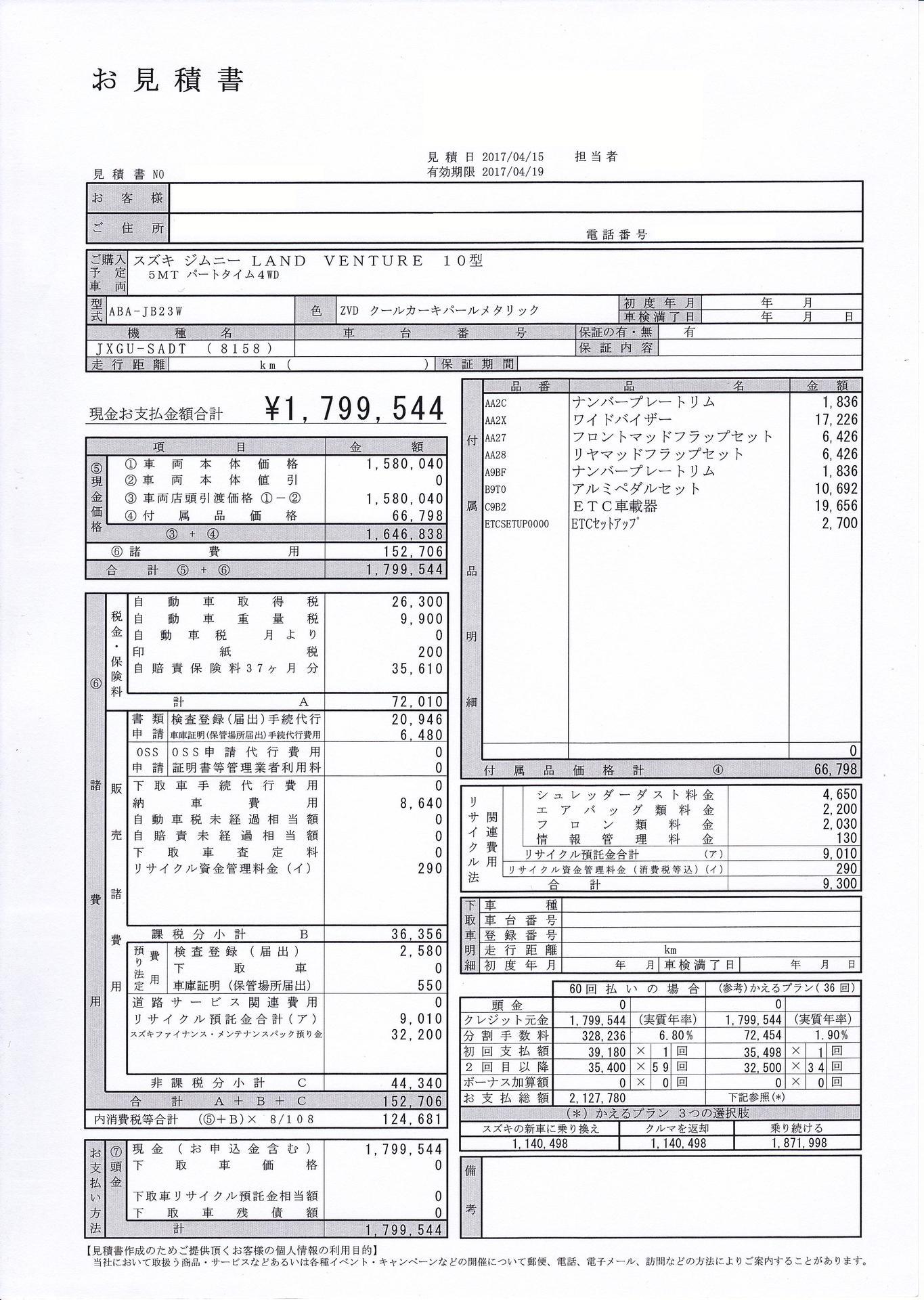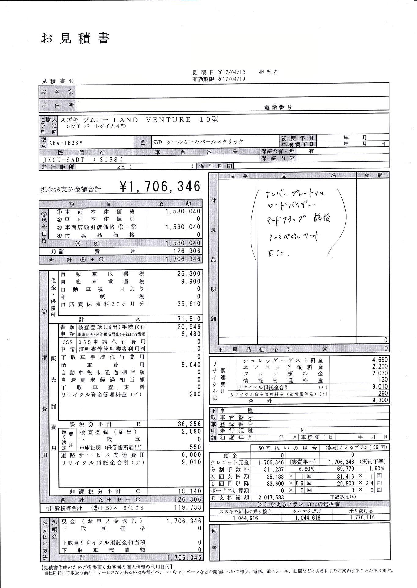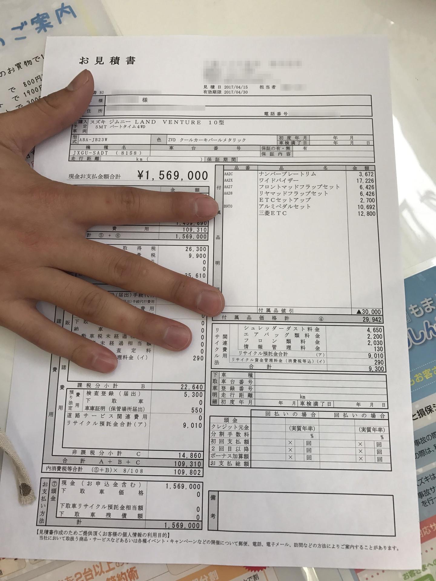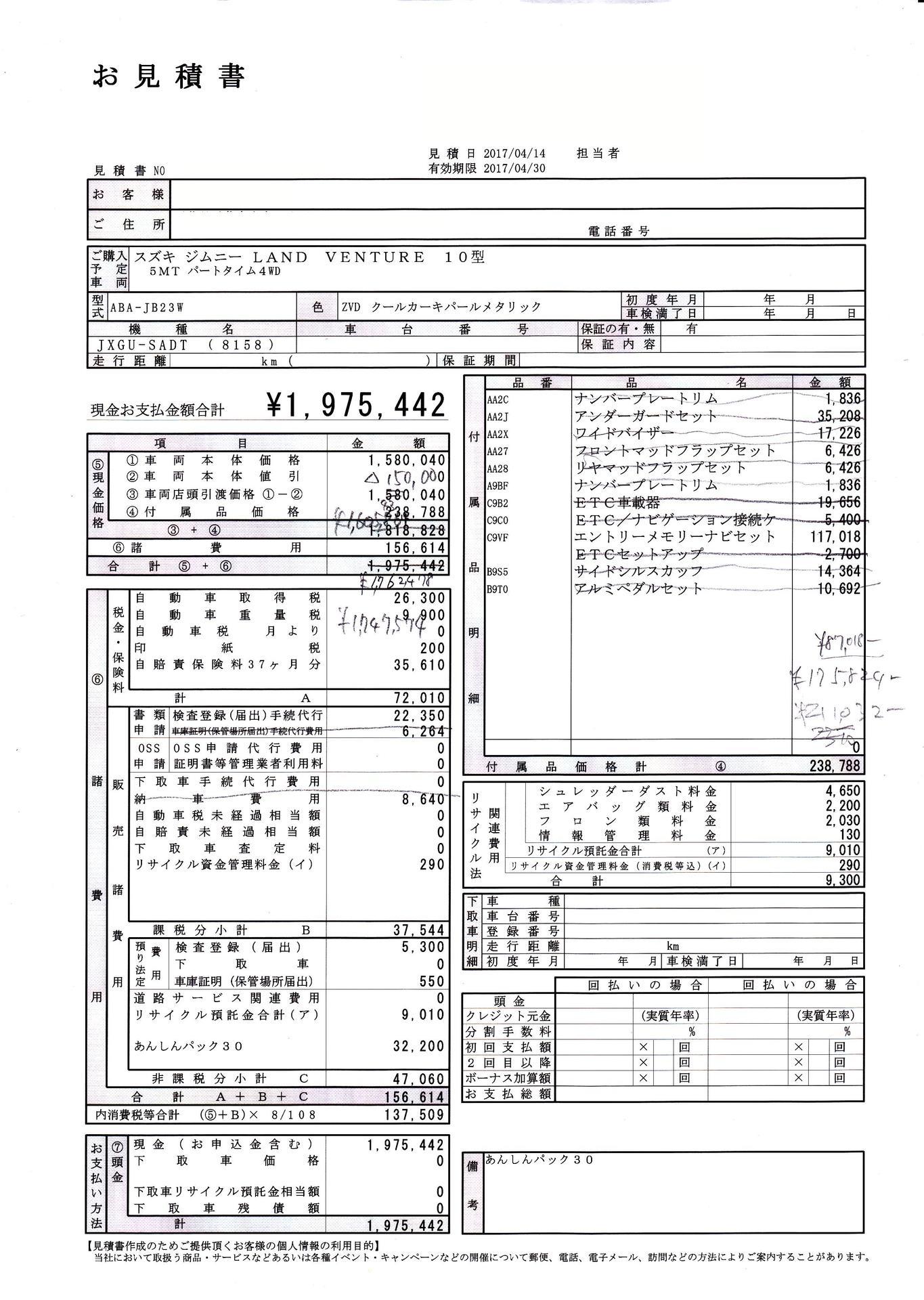 まずはおおまかに全体像を確かめるため、試乗したディーラーで見積もりをもらいました。