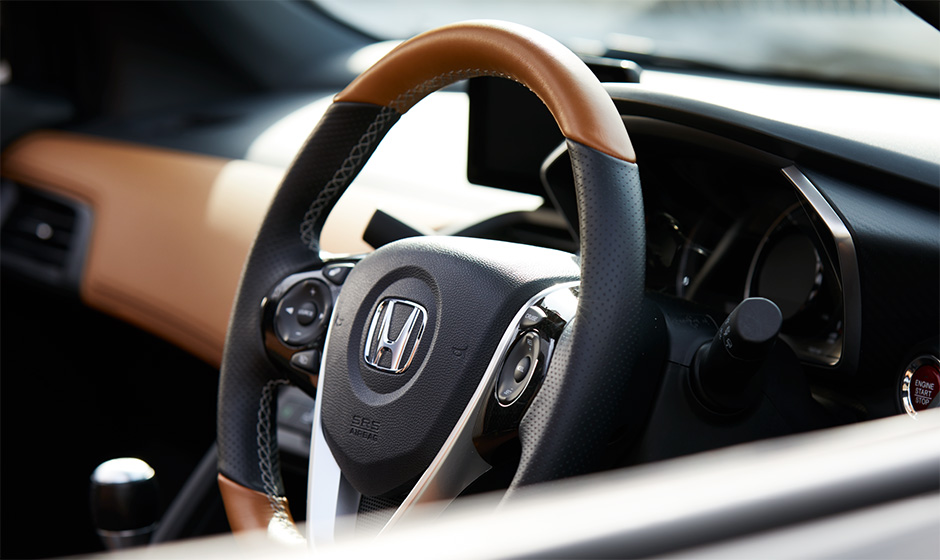 ブラウンのアクセントが鮮やかに映える、本皮巻きステアリングホイール