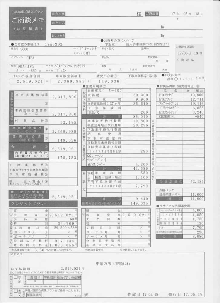 気になるのは乗り出し価格です。軽自動車で一番高額なS660の更に特別仕様車ということで、乗り出し価格が幾らになるのか、見積もりを頂きました。