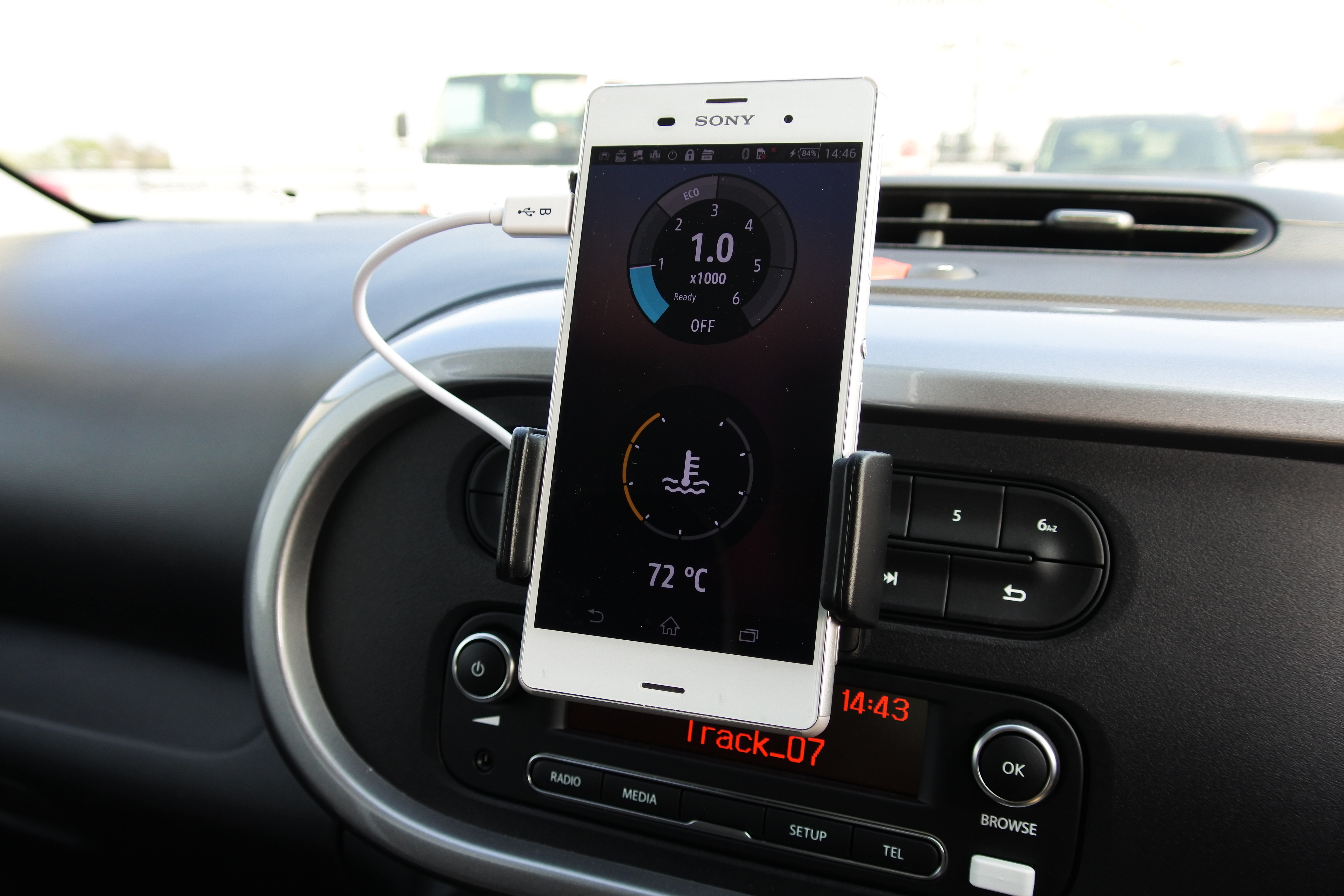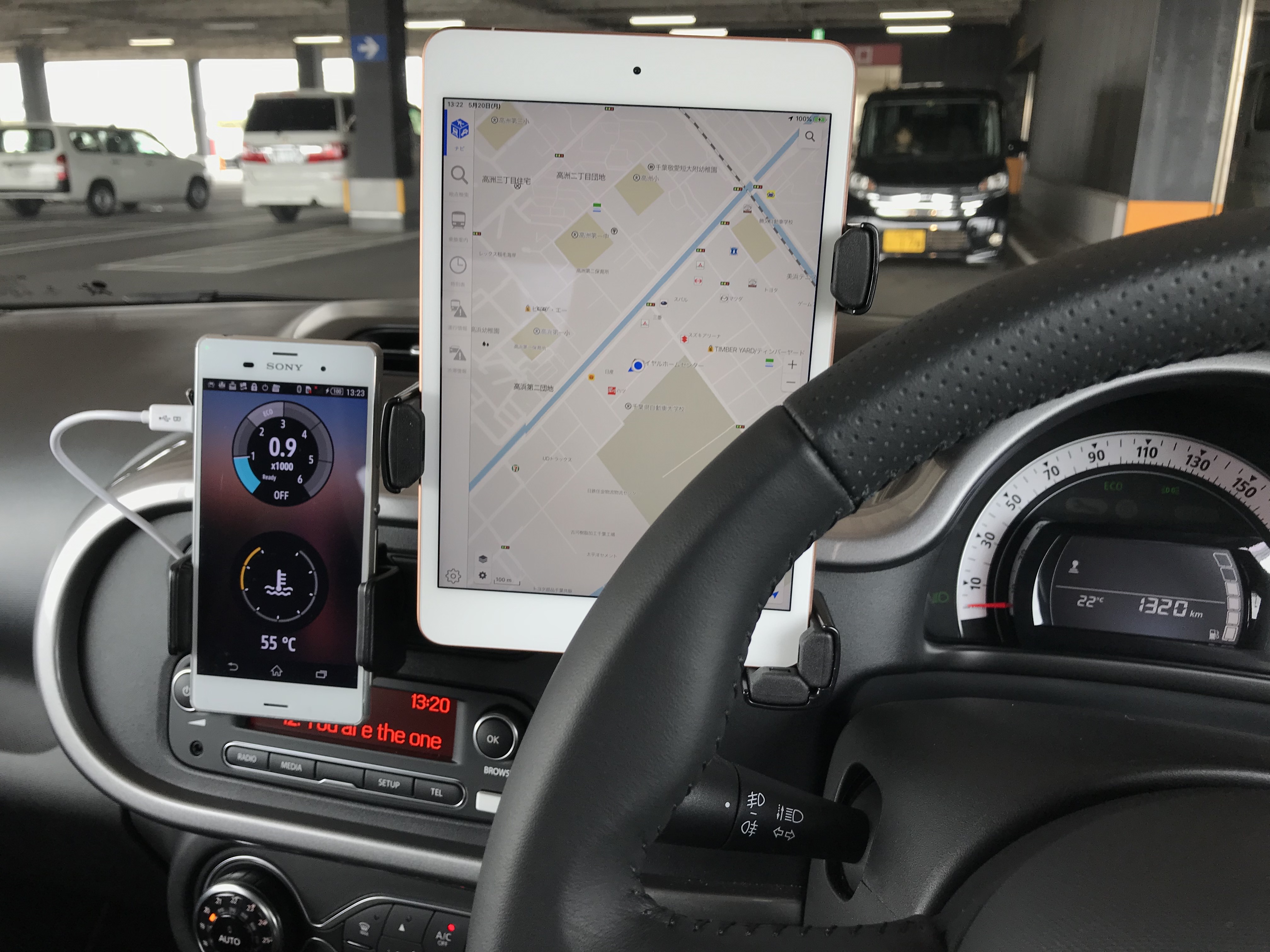 タコメーター表示のためにスマフォを接続してるけど、これは回線なしのトゥインゴ専用スマフォ。